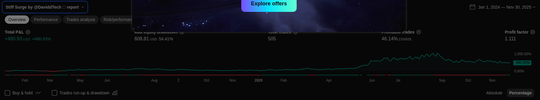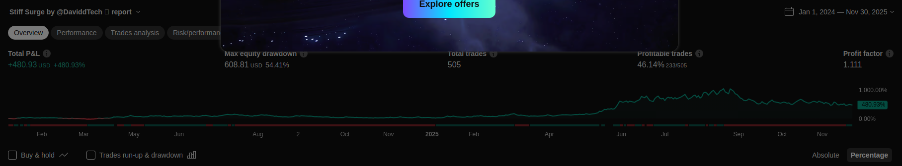 | 2025 | +40.02% +12.29% Simple P&L | +41.71% +16.14% Simple P&L | +11.59% +13.54% Simple P&L | +29.23% +19.93% Simple P&L | Login to see results | Login to see results | Login to see results | Login to see results | Login to see results | Login to see results | Login to see results | +0.00% +0.00% Simple P&L |