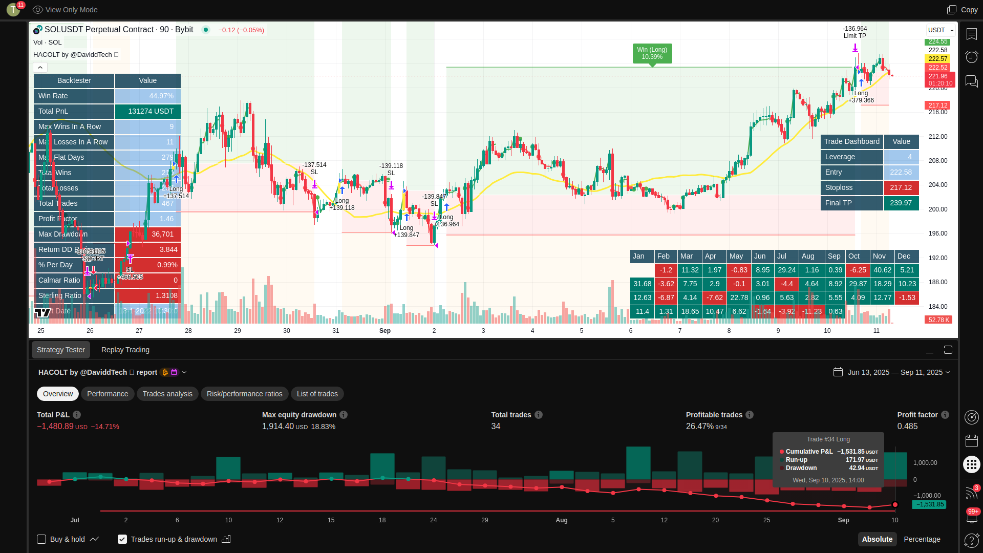 Comprehensive monthly breakdown showing both cumulative (compounded) returns and simple P&L sums. Each cell displays both metrics for complete transparency.