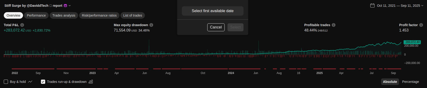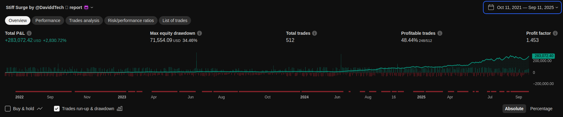 2025 | +92.09% +4.55% Simple P&L | +47.48% +3.90% Simple P&L | +239.86% +11.21% Simple P&L | Login to see results | Login to see results | Login to see results | Login to see results | Login to see results | Login to see results | Login to see results | +0.00% +0.00% Simple P&L | +0.00% +0.00% Simple P&L |