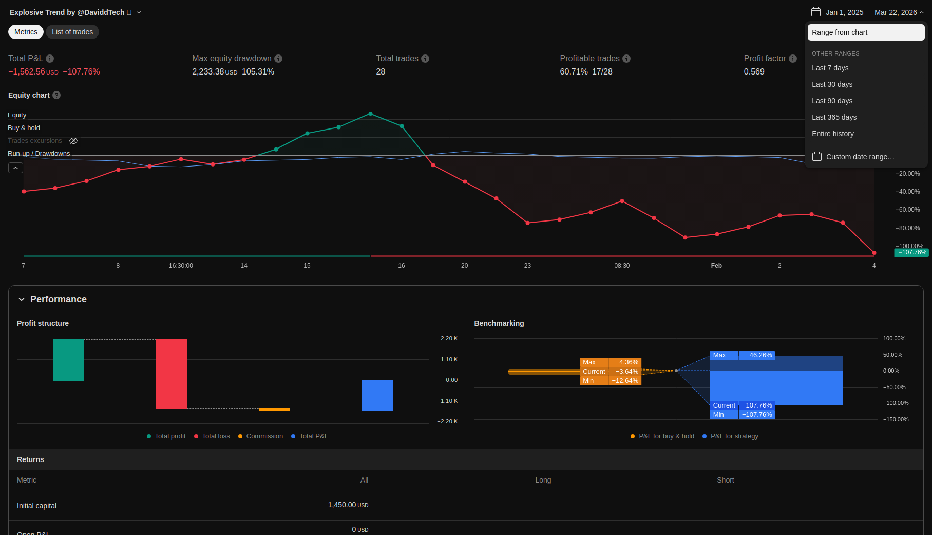 | Max Equity Drawdown (intrabar) | 2233.38 | 105.31 | ||||