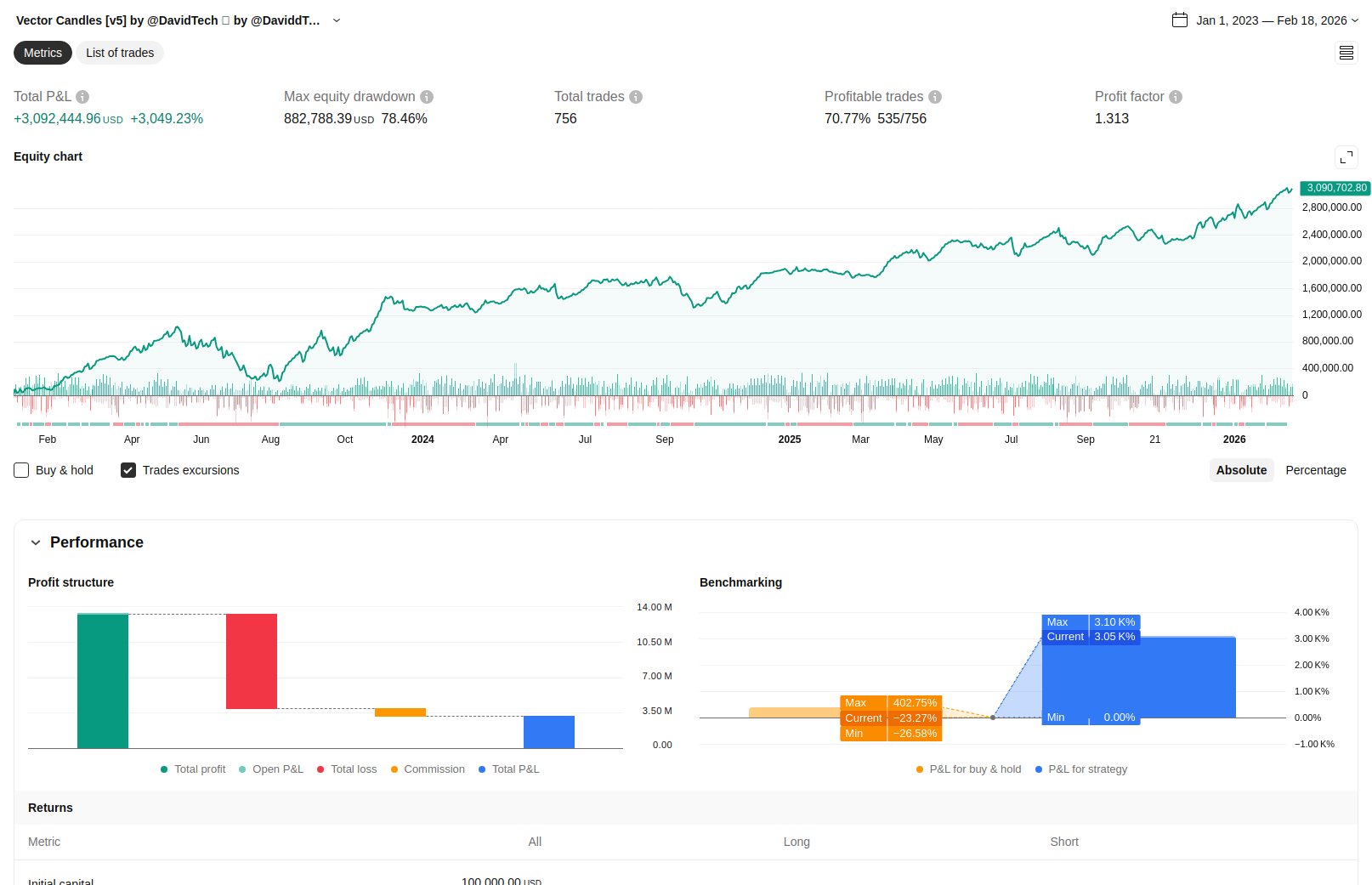 | Max Equity Run-up (intrabar) | 3133683.77 | 96.96 | ||||
